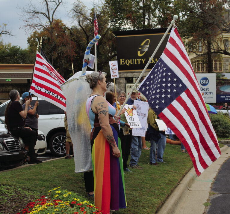 A crowd of Eureka Springs residents turned out for the latest ‘No Kings’ protest on Saturday, Oct. 18. The local protest was one of approximately 2,700 that took place across the United States, with an estimated total of nearly seven million people participating.